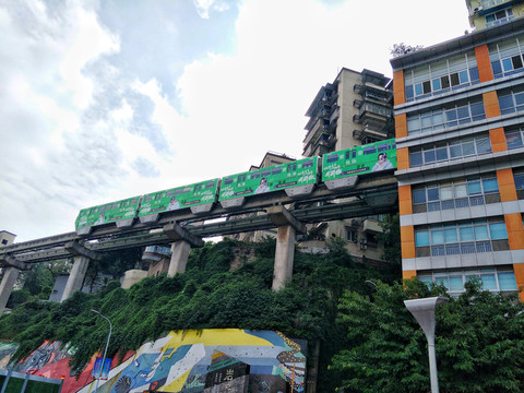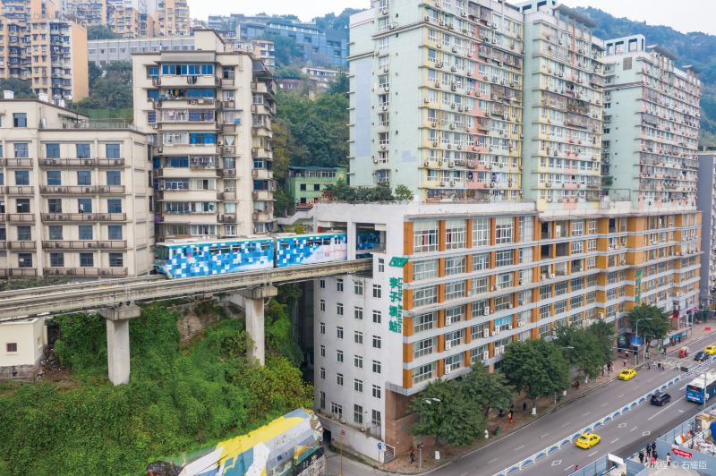 当地网红的轻轨站,轻轨列车从大楼中穿墙而过。